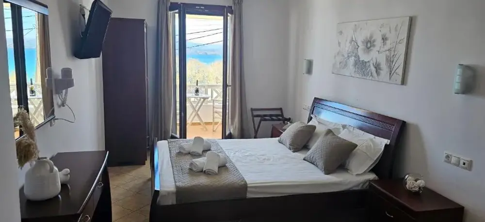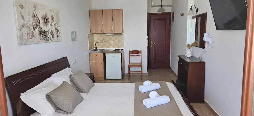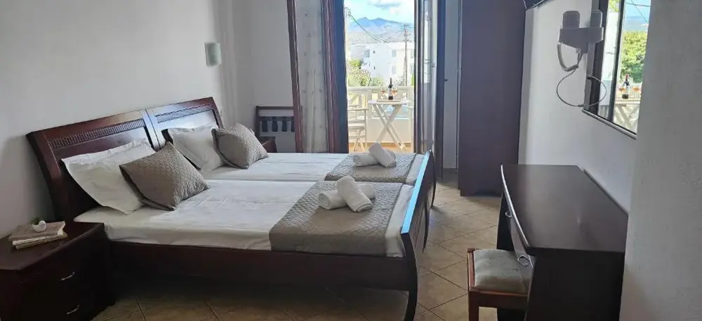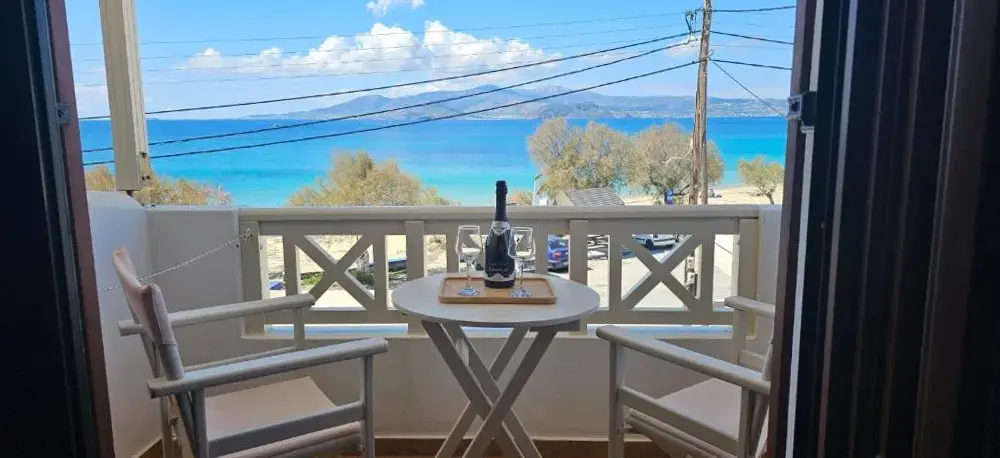 L'hotel è in cima a un'attività di noleggio di motociclette e non ha fascino ... è di fronte a una spiaggia totalmente organizzata, con tuboni ... ma c'è la strada nel mezzo, una strada con molto traffico, autobus, auto ecc. Prokovios a nessuno ... è lontano dalla città di Naxos, anche se c'è un servizio di autobus, il taxi è costoso. È meglio rimanere nella città di Naxos e da qui scoprire l'isola magnifica, niente a che fare con Ag.prokovios